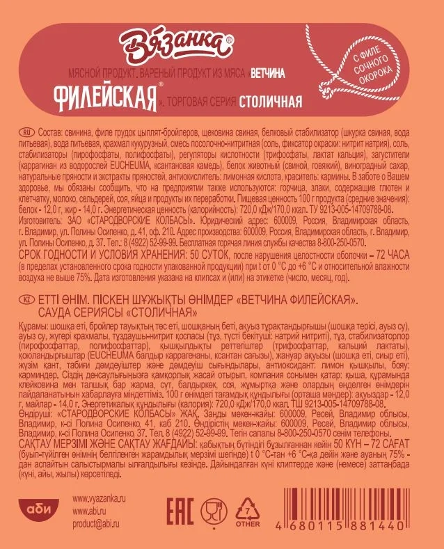 Ветчина Филейская от Вязанки: неповторимый вкус, аромат и сочность свиного окорока не оставят равнодушным ни одного члена семьи. Цельные кусочки мяса в ветчине Филейская от Вязанки делают ее более сытной, и заботливым мамам будет легче вкусно накормить своих детей. Пряности в составе ветчины гармонично сочетаются между собой и придают продукту пикантность. Она замечательно подходит для приготовления бутербродов или мясных салатов.