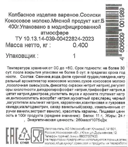 Сосиски Клинский кокосовое молоко, 400г