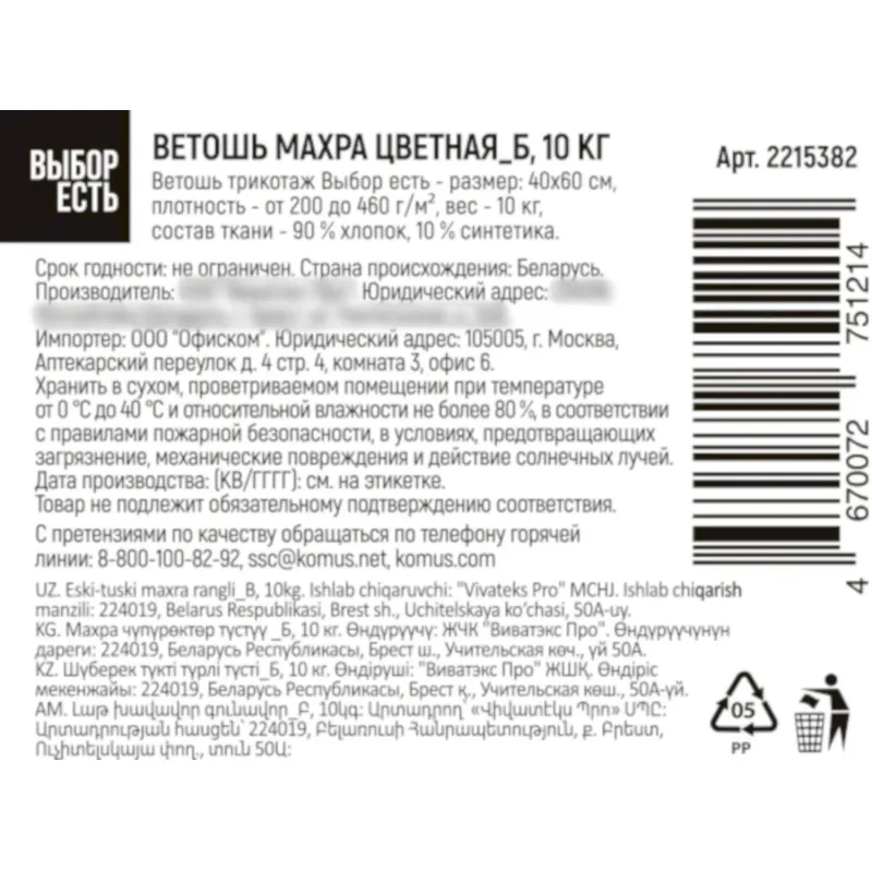 Ветошь махровая цветная 10кг (размер лоскута 60x60см). Ветошь предназначена для уборки, мытья полов ииспользования вкачестве обтирочного материала. Она также подходит для полировки поверхностей, как упаковочный иукрывной материал, атакже вличной гигиене итворческих проектах. Состав ткани включает80% хлопка и20% смесовой ткани, что обеспечивает хорошую впитываемость ипрочность. Плотность материала варьируется от180 до300г/кв.м. Размер лоскута- 60x60см. Общий вес ветоши составляет 10кг. Ветошь также может быть использована как фильтрующий материал.