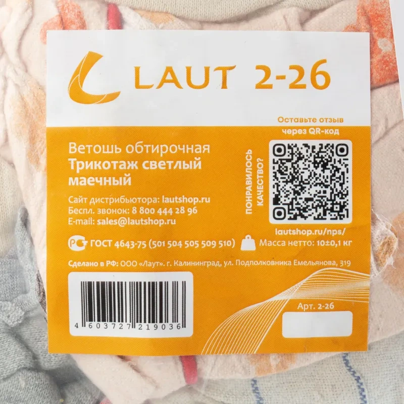 Переработанная одежда секонд-хенд светлых и пастельных тонов (исключительно тонкие и средней толщины трикотажные изделия: майки, футболки, поло, водолазки, тонкие толстовки, тонкое трикотажное бельё). Материал прочный, мягкий, хорошо впитывает масло, воду, нефтепродукты. Может применяться в различных сферах производства. Важное свойство ткани — хорошо растягивается, что позволяет проникнуть в труднодоступные для протирки места, обладает отличной прочностью и лёгкостью. После обтирки отлично видны загрязнения, ветошь устойчива к линьке и подходит для работы с растворителями.
