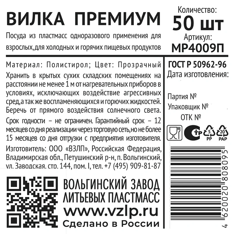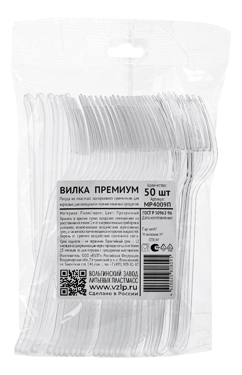 Вилка одноразовая Vzlp Премиум пластиковая прозрачная, 50шт
