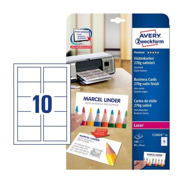 Визитные карточки Avery Zweckform Quick&Clean C32026-10, белые сатиновые, 85х54мм, 270г/м2, 10шт на листе А4, 10 листов