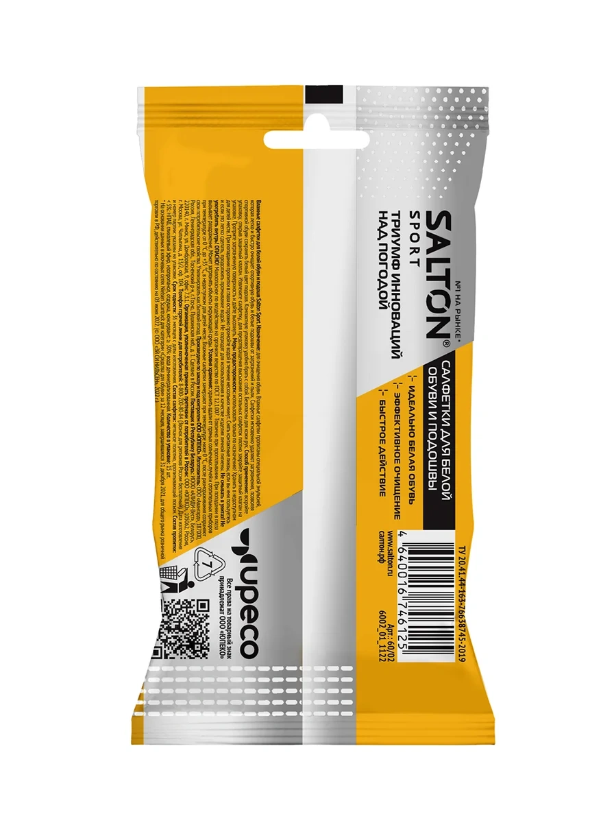 Если вы любите комфорт, ведёте активный образ жизни и разбираетесь в моде, то наверняка в вашем гардеробе есть кеды или кроссовки. И не одна пара. Будь вы спортсмен или просто предпочитаете стиль спортшик, вы столкнётесь с ситуацией, когда необходимо будет освежить кроссовки от пыли и грязи и очистить белую подошву. Чтобы ваша обувь всегда сияла белизной и была как новенькая, достаточно взять с собой влажные салфетки Salton Sport. Они очень компактные, их удобно положить в карман, рюкзак или сумку. Влажные салфетки Salton Sport в отличие от обычных влажных салфеток пропитаны специальной эмульсией, которая быстрее и легче очищает белую обувь от пыли и загрязнений, не оставляя грязных разводов. Очищайте мгновенно и с лёгкостью белые подошвы кроссовок или же всю поверхность обуви. Тратьте энергию на свои дела, чистотой и белизной подошв ваших кроссовок займётся Salton Sport.