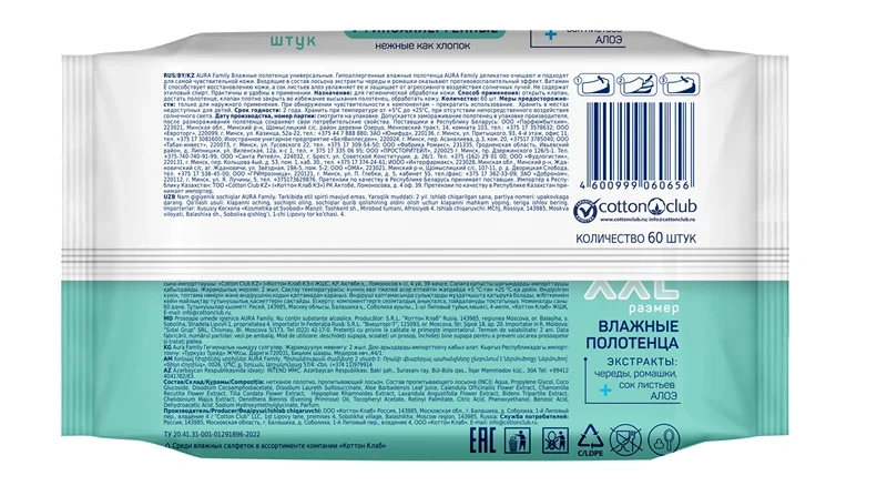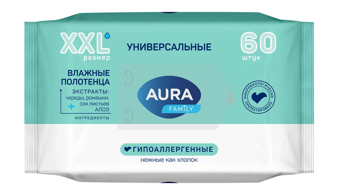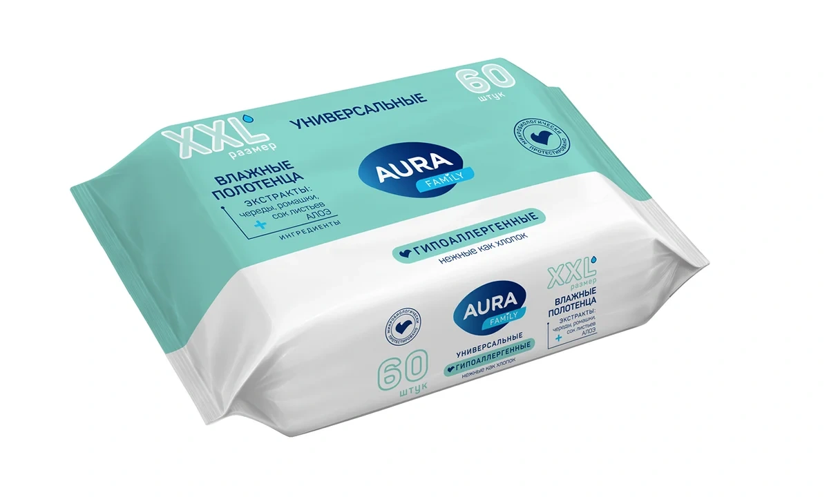Полотенца влажные Aura Family универсальные гипоаллергенные, 60шт
