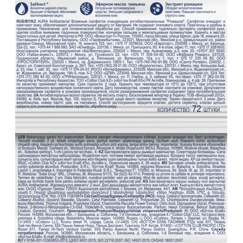 Салфетки влажные Aura антибактериальные, 72 шт
