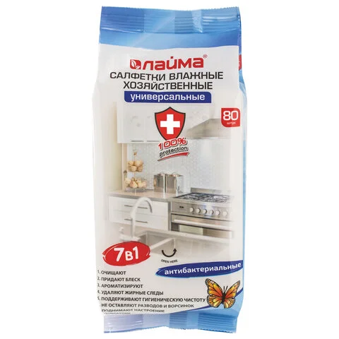 Влажные салфетки Laima Универсальные 7в1, антибактериальные, 80шт/уп, в пачке