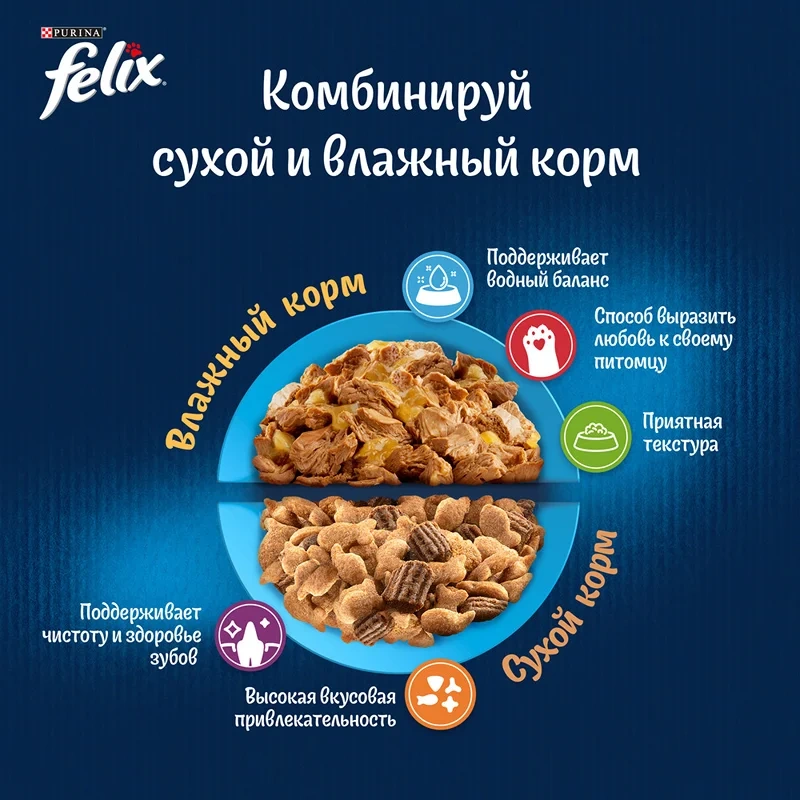 Каждый котик желает наслаждаться совершенно особенным кормом, у которого будет такой аппетитный вид и аромат, словно Вы приготовили его сами. Каждый пакетик корма для взрослых кошек Аппетитные кусочки содержит нежные кусочки в сочном желе – вкуснятину, от которой кота за уши не оттащишь! Эксперты , разрабатывая влажные корма для домашних любимцев, создали корм для взрослых кошек Felix Аппетитные кусочки — специально для Вашего любителя вкуснятины. Влажный корм для кошек Felix Аппетитные кусочки — полнорационный, содержит все необходимое для здоровой активной долгой жизни. Является источником необходимых Омега-6 жирных кислот с правильным сочетанием минеральных веществ и витаминов.