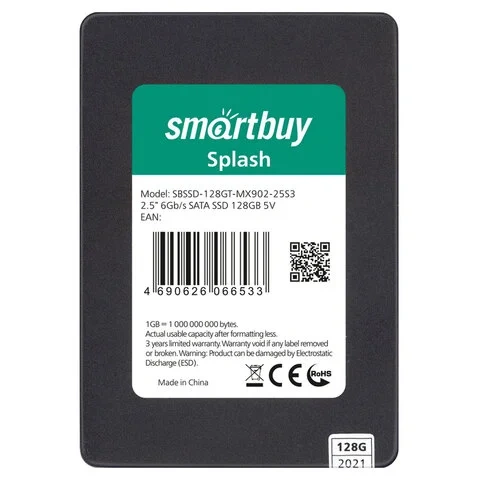 Твердотельный накопитель SSD SMARTBUY Splash 128GB, 2,5', SATA III, черный, SBSSD-128GT-MX902-25S3
