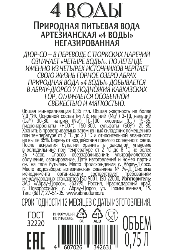 Вода Абрау Дюрсо 4 воды без газа, 750мл x 6 шт добывается в предгорье Северного Кавказа, в источнике, расположенном неподалеку от черноморской бухты Дюрсо. Проведенные микробиологические исследования показали, что местная артезианская вода богата такими микроэлементами, как магний, кальций, калий и натрий. Она обладает повышенной мягкостью и приятной свежестью, что позволяет отнести ее к первой категории качества.