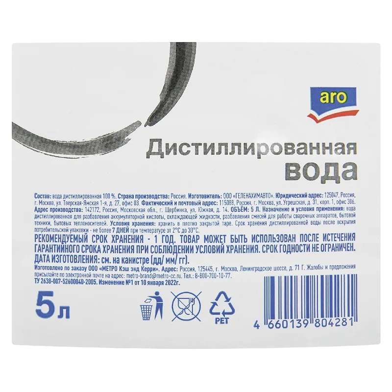 Произведена по технологии, основой которой является 2х-ступенчатый обратный осмос. Благодаря использованию современного оборудования, дистиллированная вода соответствует ГОСТ 58144-2018 и всем международным нормам и стандартам. В отличие от водопроводной или просто очищенной воды, дистиллированная практически не содержит примесей и посторонних включений, а также обладает низкой удельной электропроводностью. Применяется для корректировки плотности электролита, промывки системы охлаждения, разбавления концентратов охлаждающих жидкостей, для корректировки температуры замерзания незамерзающей стеклоомывающей жидкости и при цветной фотопечати, а также в любых областях, где рекомендовано ее использование.