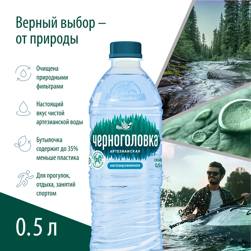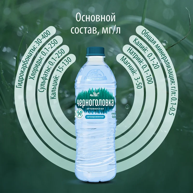 Черноголовка - вода для современных людей, живущих в режиме многозадачности, которым мы предлагаем воду, прошедшую природную фильтрацию, дающую вкус живой природы в городе и переключающую на природное состояние, в котором чувствуешь и фокусируешься на том, что по-настоящему важно. Каждая капля воды Черноголовка негазированная очищается природными фильтрами, многовековыми слоями песка и обогащается полезными минеральными веществами, соотношение которых органично сбалансировано самой природой. Бутылочки воды Черноголовка содержат до 35% меньше пластика – это легкий и удобный способ заботиться не только о себе, но и о природе.