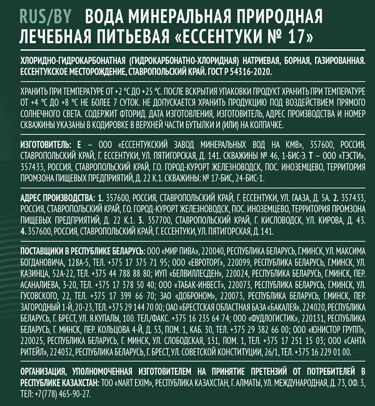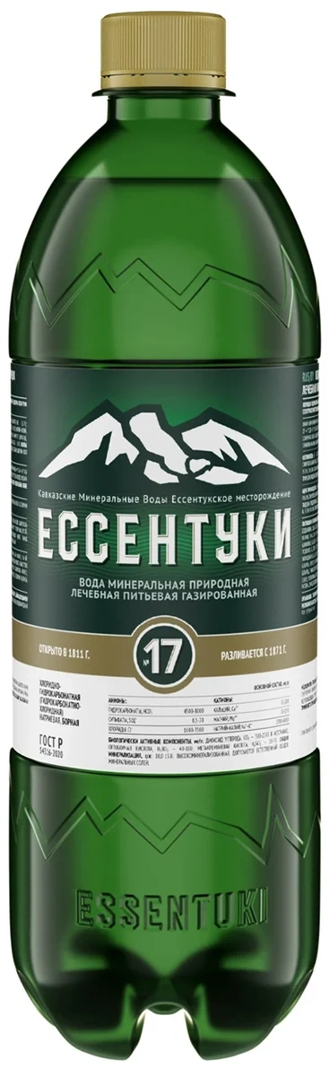 Вода Ессентуки №17 минеральная газированная, 750мл x 6 шт - вода минеральная природная лечебная питьевая газированная. Хлоридно-гидрокарбонатная (гидрокарбонатно-хлоридная) натриевая, борная высокой минерализации 10-14г/л. Обладает насыщенным солоноватым вкусом. Природа формирует Ессентуки на протяжении более чем 800 лет: дождевая и талая воды просачиваются через породы Кавказских гор, которые под действием древнего вулкана Эльбруса растворяются, обогащая воду полезными минералами и газами. Имеет приятную газацию и насыщенный солоноватый вкус. Но главное в ней - повышенная минерализация. Дождевая и талая воды, просачиваясь через горные породы, обогащаются полезными веществами и газами. Природный напор в скважинах настолько силён, что вода Ессентуки выходит на поверхность самостоятельно с глубины более чем 200?1000м. Уровень pH: 6,5–6,9. Благодаря богатому химическому составу, Ессентуки №17 имеет лечебное назначение. Специалист может порекомендовать эту воду при хроническом гастрите, нарушенном обмене веществ, при болезнях кишечника, печени, желчного пузыря, желчевыводящих путей, поджелудочной железы. При перечисленных заболеваниях вода применяется только вне фазы обострения.