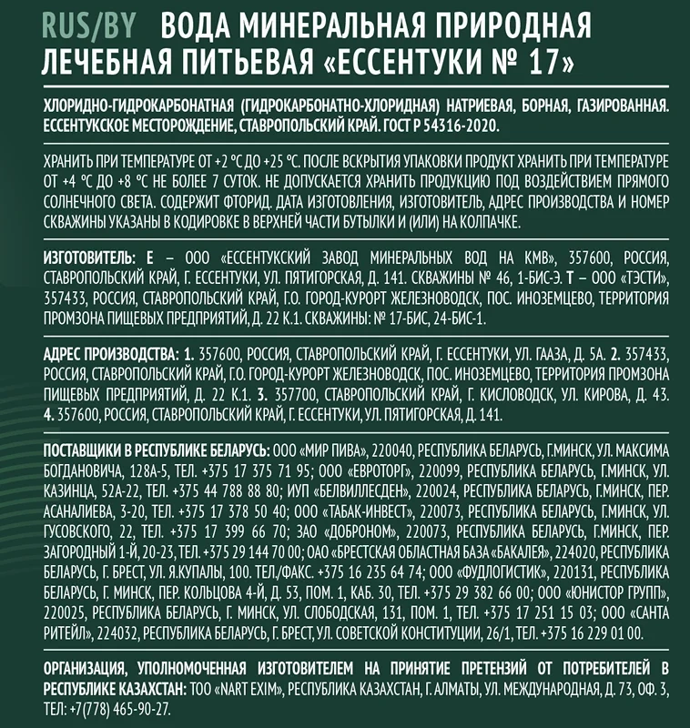 Ессентуки №17 - вода минеральная природная лечебная питьевая газированная. Хлоридно-гидрокарбонатная (гидрокарбонатно-хлоридная) натриевая, борная высокой минерализации 10-14г/л. Обладает насыщенным солоноватым вкусом. Природа формирует Ессентуки на протяжении более чем 800 лет: дождевая и талая воды просачиваются через породы Кавказских гор, которые под действием древнего вулкана Эльбруса растворяются, обогащая воду полезными минералами и газами. Имеет приятную газацию и насыщенный солоноватый вкус. Но главное в ней - повышенная минерализация. Дождевая и талая воды, просачиваясь через горные породы, обогащаются полезными веществами и газами. Природный напор в скважинах настолько силён, что вода Ессентуки выходит на поверхность самостоятельно с глубины более чем 200?1000м. Уровень pH: 6,5–6,9. Благодаря богатому химическому составу, Ессентуки №17 имеет лечебное назначение. Специалист может порекомендовать эту воду при хроническом гастрите, нарушенном обмене веществ, при болезнях кишечника, печени, желчного пузыря, желчевыводящих путей, поджелудочной железы. При перечисленных заболеваниях вода применяется только вне фазы обострения.