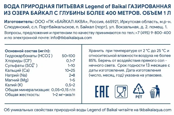 Вода Legend of Baikal питьевая газированная, 1л