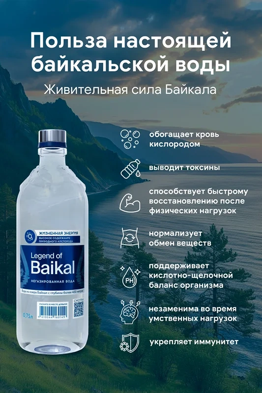 Вода добывается с глубины 400 метров из особых слоев, насыщенных кислородом и не подверженных влиянию внешних загрязнений. Вода проходит очистку сохраняя натуральную природную минерализацию. Благодаря высокому содержанию природного кислорода (12 мг/л) вода Legend of Baikal активирует иммунную систему и обладает восстановительными свойствами для организма. Прошла множество исследований и соответствует всем мировым стандартам питьевой воды. Единственный завод на берегу озера Байкал, разливающий воду непосредственно сразу после ее добычи