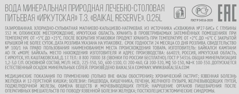 Представляет собой воду с низкой минерализацией, которая рекомендуется для ежедневного употребления в качестве питьевой воды дома и в офисе. Газированная лечебно — столовая минеральная вода низкой минерализации, добывается с глубины более 350 метров в байкальском регионе. На такой глубине вода полностью защищена от каких-либо воздействий и сохраняет свой сбалансированный природный состав неизменным. Лечебные свойства минеральной воды Байкал Резерв известны людям с 60-х годов прошлого века. Байкал Резерв помогает пищеварению и улучшает кровоснабжение всего организма. Минеральная вода добывается из холодного источника, поэтому сохраняет лечебные свойства в течение длительного времени.