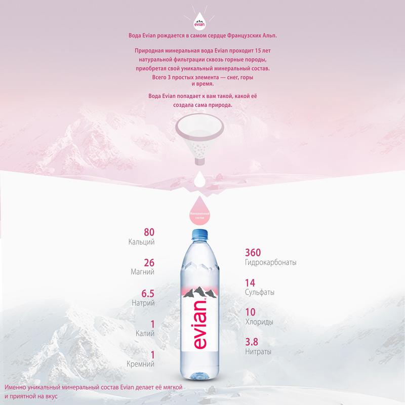 Минеральная вода Evian зарождается в прекрасном и живописном месте, в самом сердце Альп. Капли дождя и снега, просачиваясь сквозь многочисленные геологические слои, медленно очищаются и насыщаются минералами во время продолжительного контакта с земными породами.