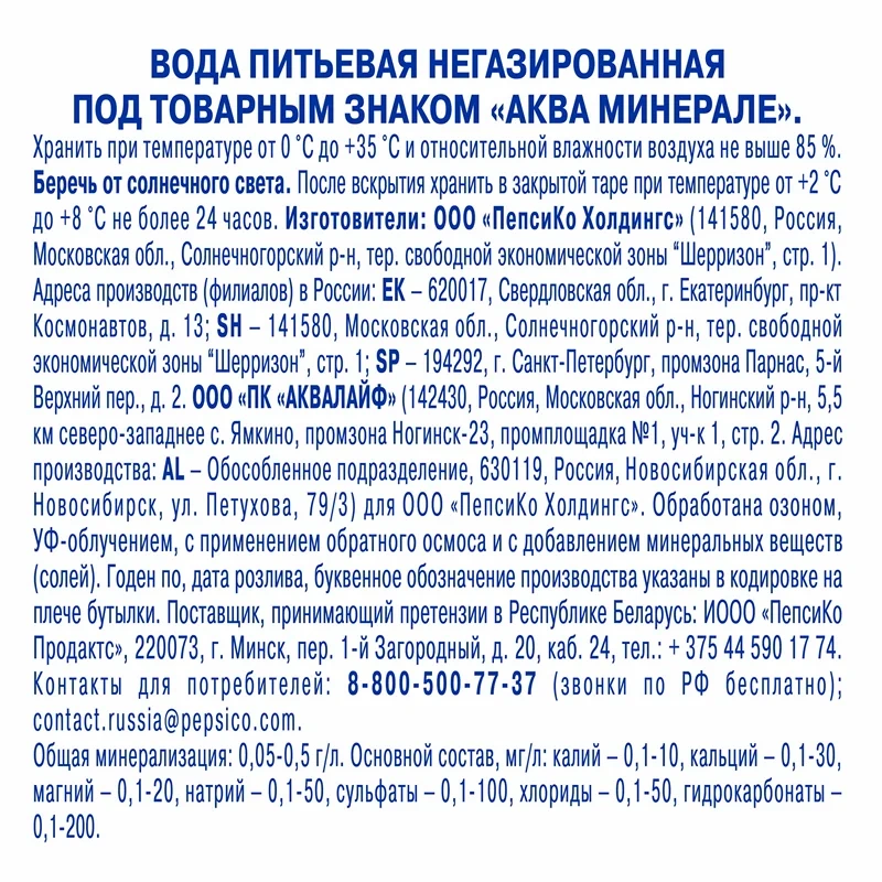 Для производства питьевой воды Аква–Минерале используют артезианскую воду, поднятую на поверхность с глубинных от 70 до 300 метров. В процессе производства исходная артезианская вода фильтруется на многослойных песочных фильтрах, проходит очистку на современных установках обратного осмоса. На финальной стадии обработки вода проходит многоступенчатую фильтрацию на полировочных фильтрах. Отфильтрованная таким образом вода пропускается через установку ультрафиолетового обеззараживания, затем насыщается озоном и только потом передается на розлив. Необходимо отметить, что наполнение бутылок водой Аква–Минерале проводится в среде азота. Что обеспечивает сохранение уникальных вкусовых и физико–химических свойств готовой продукции в течение двух и более лет.