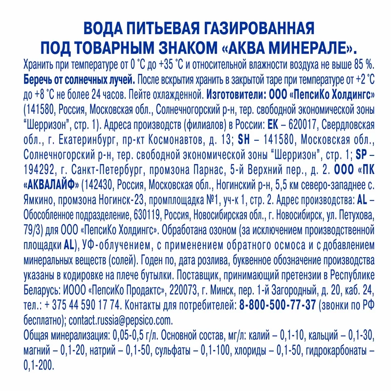 Для производства питьевой воды Аква–Минерале используют артезианскую воду, поднятую на поверхность с глубинных от 70 до 300 метров. В процессе производства исходная артезианская вода фильтруется на многослойных песочных фильтрах, проходит очистку на современных установках обратного осмоса. На финальной стадии обработки вода проходит многоступенчатую фильтрацию на полировочных фильтрах. Отфильтрованная таким образом вода пропускается через установку ультрафиолетового обеззараживания, затем насыщается озоном и только потом передается на розлив. Необходимо отметить, что наполнение бутылок водой Аква–Минерале проводится в среде азота. Что обеспечивает сохранение уникальных вкусовых и физико–химических свойств готовой продукции в течение двух и более лет.