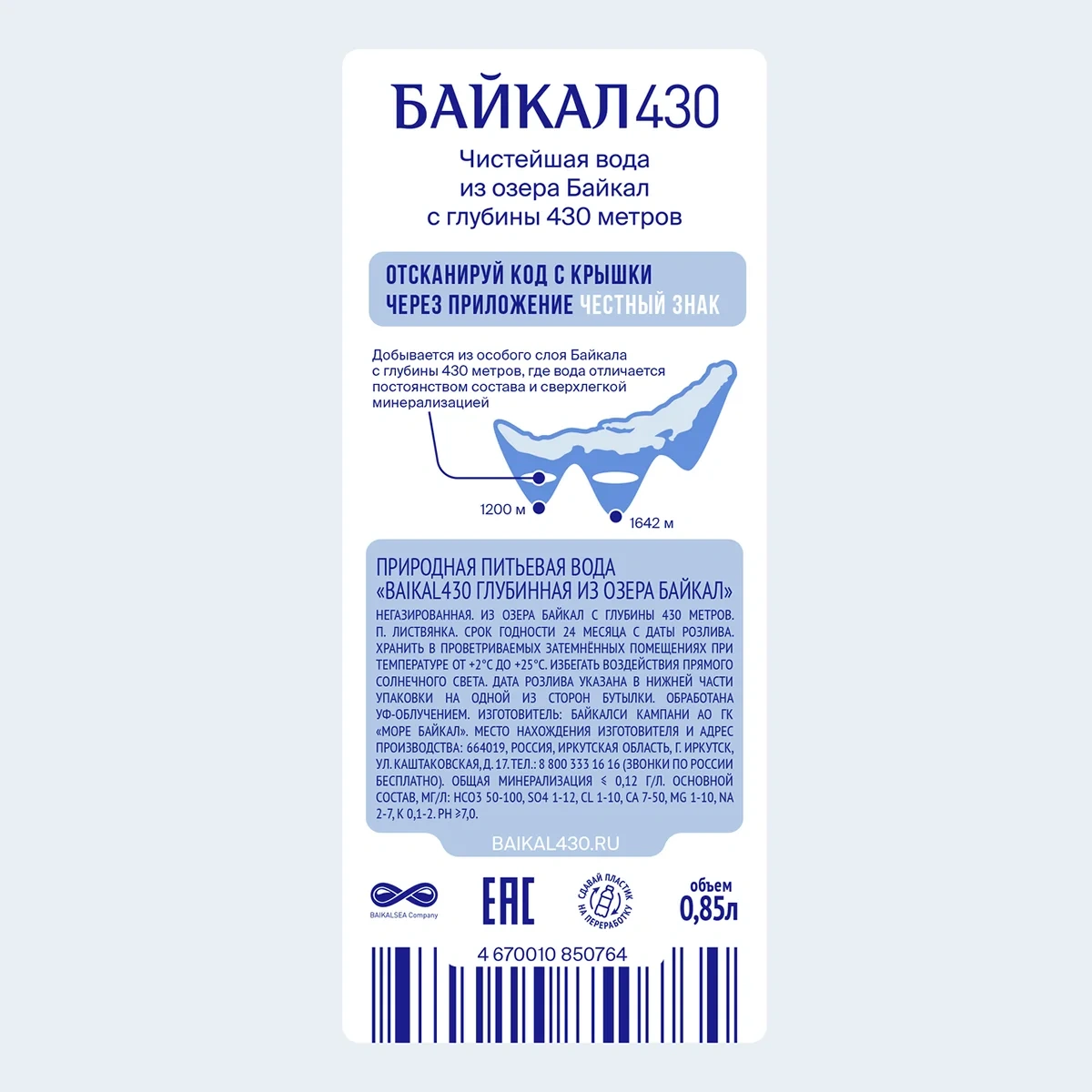 BAIKAL430 – реликтовая вода из озера Байкал с глубины 430 метров, сохранившаяся в первозданном виде. Она воплощает силу, неподвластную времени, и непоколебимое спокойствие великого озера. Растворенный в Байкале кислород придает воде свежесть вкуса, а сверхлегкая минерализация восполняет водно-солевой баланс.