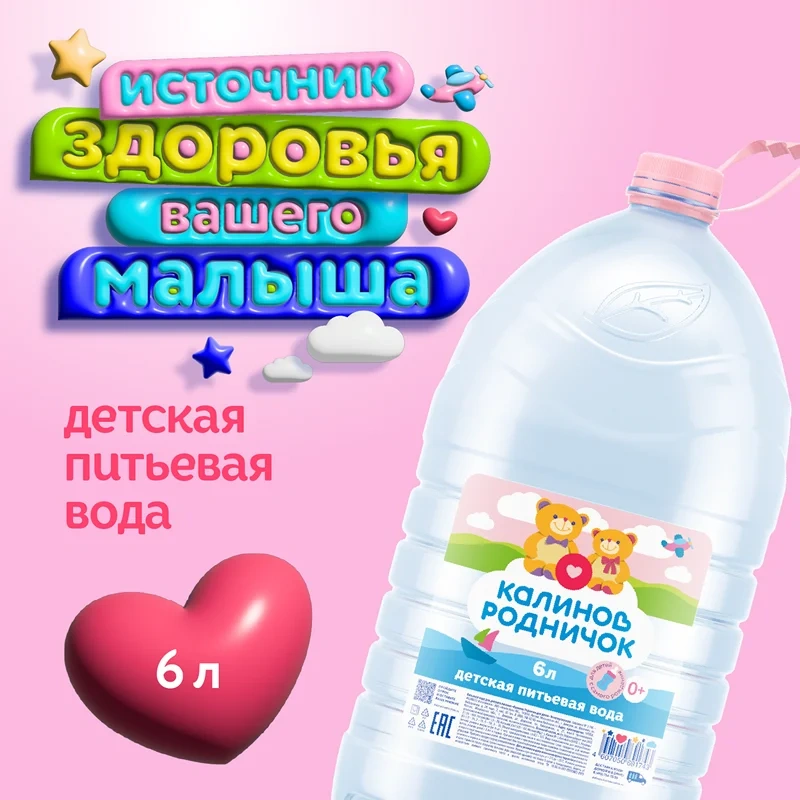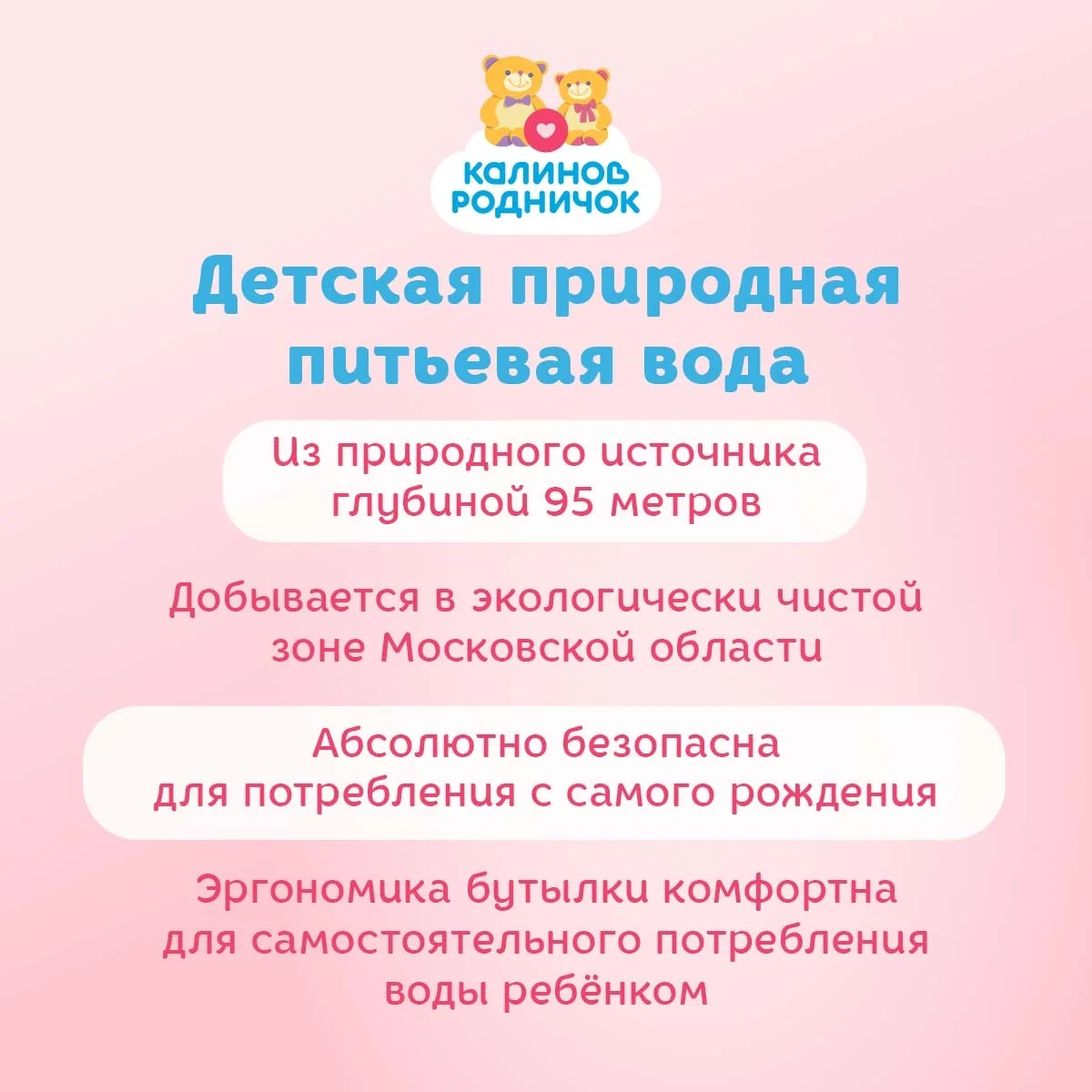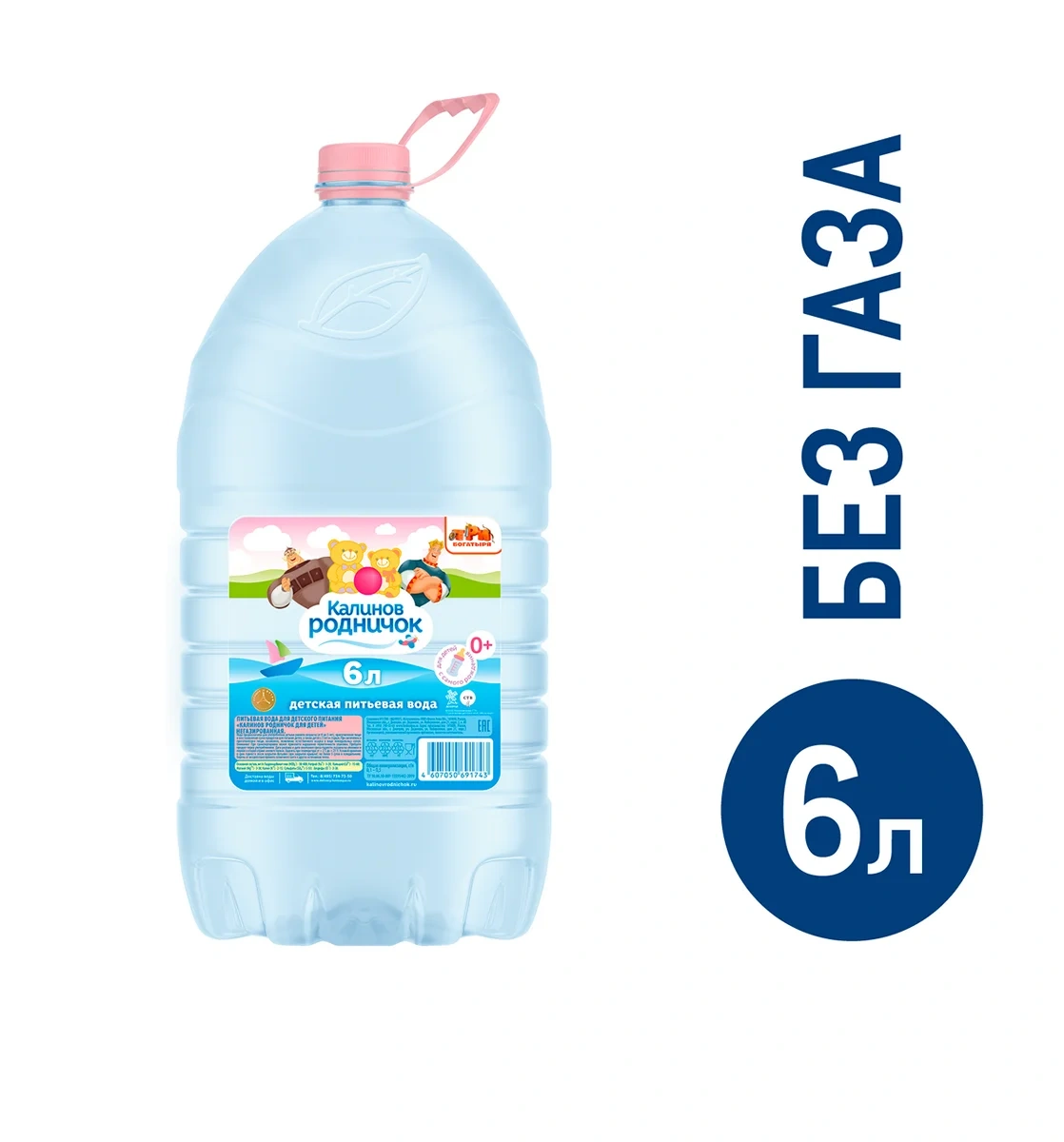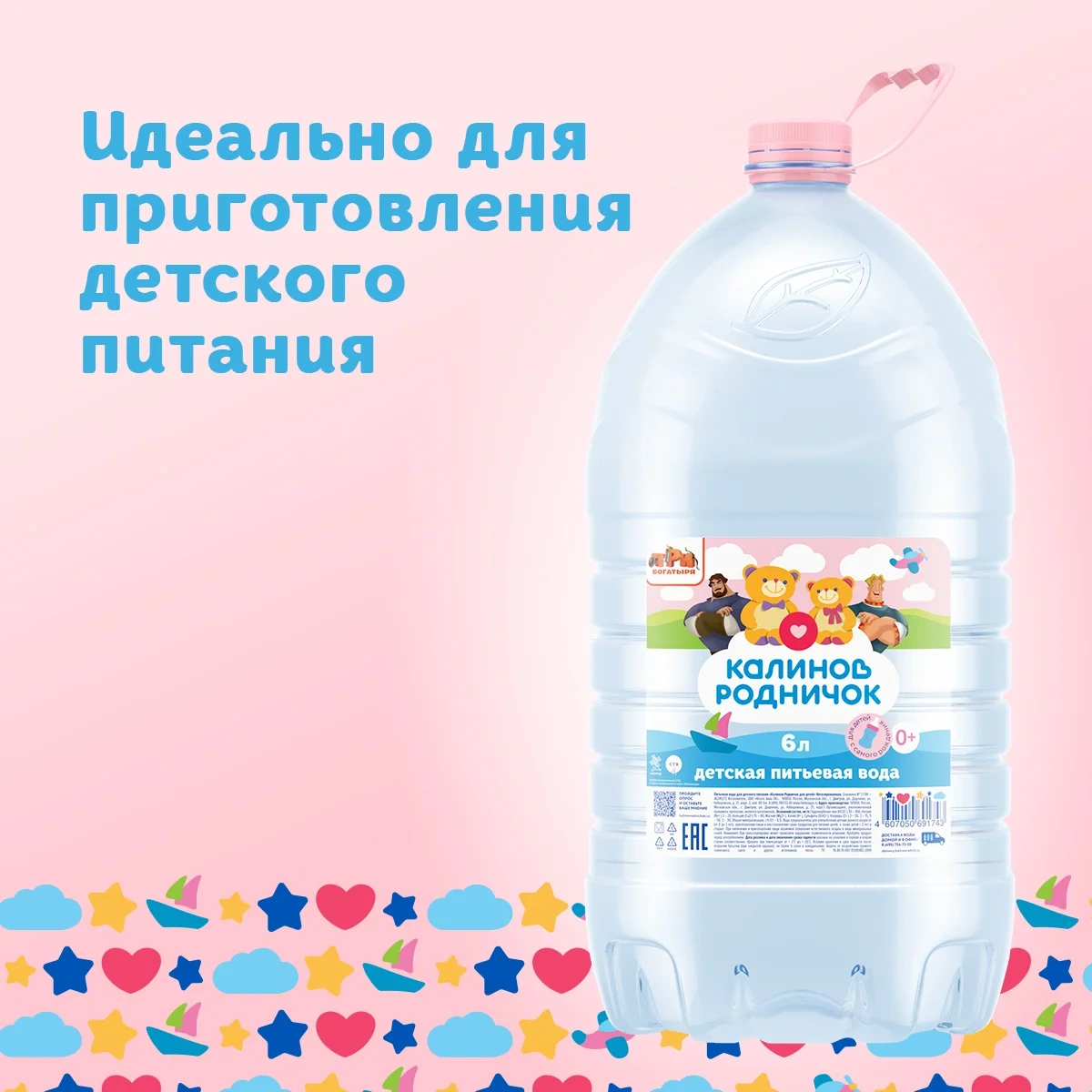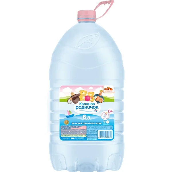 Детская вода Калинов Родничок рекомендована с первых дней жизни малыша, отлично подходит для будущих и молодых мам. Сбалансированный состав воды из природной скважины полезен для растущего организма: Калинов Родничок содержит все необходимые макро- и микроэлементы для развития ребенка. Детской водой, подогретой до 37-40 градусов, удобно разводить каши и сухие смеси, при этом она не требует кипячения. Калинов Родничок в большом формате 6 л выпускается с любимыми героями мультфильма Три богатыря на этикетке, которые поднимут настроение вашему малышу. Теперь вкусная и полезная вода всегда с вами – дома, на даче или отдыхе с ребёнком. Общая минерализация детской воды – 100-500мг/л, а общая жесткость – 1,5-6мг-экв/л. Калинов Родничок – источник здоровья вашего малыша.