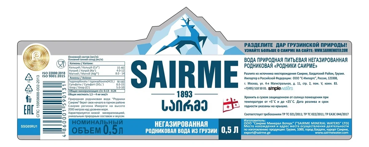 Вода Sairme родниковая негазированная, 500мл x 12 шт