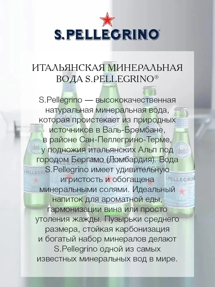 Вода минеральная Sanpellegrino газированная, 750мл x 15 шт - природная лечебно-столовая минеральная вода, газированная естественным путем. Благодаря содержанию в воде минеральных солей, она классифицируется как природная бикарбонатно-сульфатная кальциево-магниевая минеральная вода. Воду добывают из одноименного источника Сан Пеллегрино, расположенного на глубине 500 метров и выходящего на поверхность в предгорье итальянских Альп на территории Сан-Пеллегрино-Терме. Горные породы играют роль естественного фильтра для очистки воды, а натуральный газ из источника в Монтепульчано наполняет воду мелкими шипучими пузырьками. В состав воды Сан Пеллегрино входит 14 минералов, которые положительно влияют на систему пищеварения, желудочно-кишечный тракт, нормализует работу почек, выводят из организма шлаки.