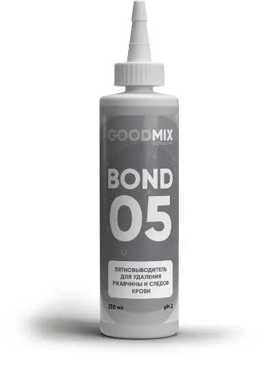 Пятновыводитель Bond 05 предназначен для профессионального удаления пятен, перед основным процессом стирки белого и цветного текстиля.Средство эффективно удаляет пятна от ржавчины, крови, оксидов металлов.Для удаления сложных многокомпонентных загрязнений может применяться с другими средствами Bond.ПРИМЕНЕНИЕ:Перед применением проверить совместимость средства с тканью на малозаметном участке. Взболтать, нанести на пятно и выдержать 1-2 минуты, не допуская высыхания поверхности. Аккуратно потереть пятно мягкой щеткой или губкой, послеэтого промыть изделие и постирать. В случае тяжелых и застарелых загрязнений увеличить время контакта изделия со средством до 5 минут, не допуская высыхания поверхности. При смене пятновыводителя, при выведении сложных загрязнений, необходимо промыть пятно водой, для удаления предыдущего средства!СВОЙСТВА:Хранить в плотно закрытой оригинальной таре при температуре от +5С до +25С в темном сухом месте отдельно от пищевых продуктов и кормов, а также щелочных, кислотных и хлорсодержащих препаратов. Не допускать воздействия прямых солнечных лучей. Средство замерзает. После размораживания и тщательного перемешивания полностью восстанавливает свои свойства.РЕКОМЕНДАЦИИ:Не смешивать с щелочными, кислотными и хлорсодержащими препаратами. Во время работы использовать средства индивидуальной защиты (очки, перчатки, спецодежду). При попадании на кожу или слизистые оболочки немедленно промыть большим количеством проточной воды. При необходимости обратиться к врачу. Хранить в недоступном для детей месте.Срок годности: 2 года от датыизготовления, при условии соблюдения правил хранения.Состав: деионизированная вода (30 % и более), органические кислоты (более 5%, но менее 15 %), неионогенные ПАВ (менее 5%), водорастворимые растворители (менее 5 %)Плотность при 20° С: 1,02-1,06 г/см3.
