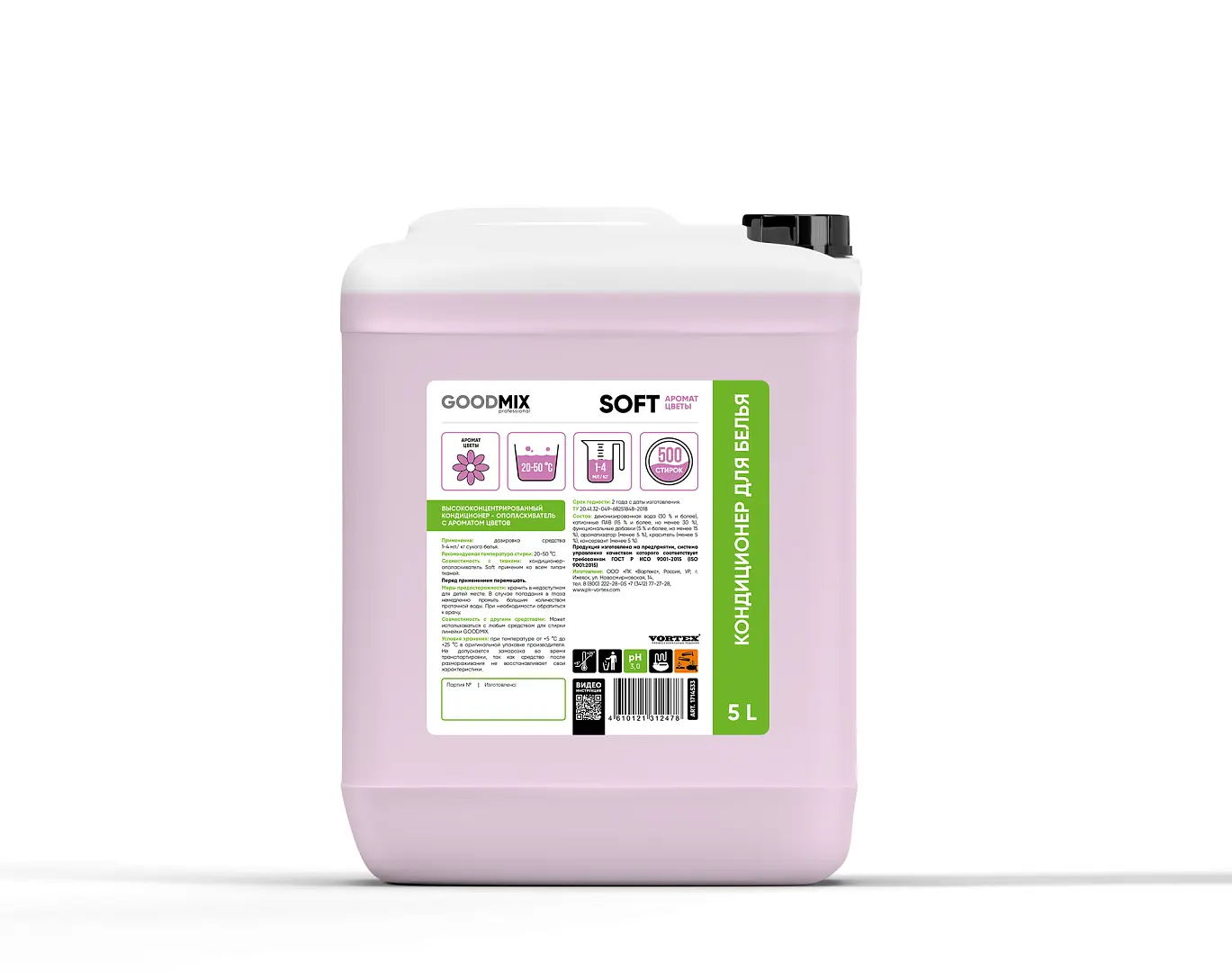 Кондиционер-ополаскиватель Mix Soft предназначен для использования в предпоследнемцикле полоскания.Преимущества:Средство придает белью мягкость и тонкий свежий аромат.Обладает антистатическим эффектом на синтетических тканях, а также облегчает процессы сушки и глажения белья.Высококонцентрированный состав средства позволяет работать в малой дозировке.Mix Soft обладает низкой вязкостью и применим для любых стиральных машин и дозирующих систем, может использоваться при ручном полоскании.Проявляет активность в мягкой и в жесткой воде.Превосходное решение для финишной обработки белья.Инструкция по применению:Перед применением перемешатьДозировка средства:Предварительный цикл ополаскивания: 4-8 мл / кг сухого бельяТемпература:Ополаскивание: 20-50 °CКонцентрация средства и температурный режим подбираются индивидуально в зависимости от типа тканей, характера и сложности загрязнений, технологических параметров стирки.Совместимость с тканями: Кондиционер-ополаскиватель Mix Soft применим ко всем типам тканей.Совместимость с другими средствами:Средство может быть скомбинировано с любым базовым средством для стирки.Состав:Деионизированная вода (более 30%), катионные поверхностно-активные вещества (более15%, но менее 30%), функциональные добавки (более 5%, но менее 15%), ароматизатор(менее 5%), краситель (менее 5%), консервант (менее 5%).
