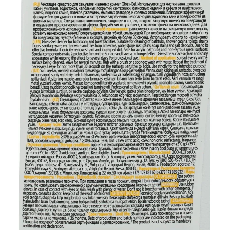 Кислотное моющее средство в виде спрея предназначено для мягкого и эффективного удаления известкового налета, жира и ржавчины с различных поверхностей. Оно подходит для обработки акриловых ванн, сантехники, раковин, унитазов, кафельной плитки и других поверхностей, стойких к кислотным средствам. Средство не царапает поверхность и снижает активность патогенной флоры.