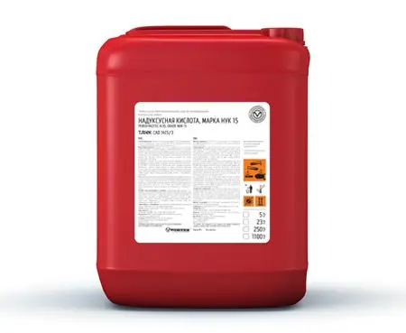 Прозрачная бесцветная жидкость с резким запахомрН (1%) - 2,0-3,0;Плотность при 200С - 1,130 - 1,170 г/см3Массовая доля надуксусной кислоты - 14,00 - 17,00%Массовая доля перекиси водорода - 16,00 - 20,00 %Состав:Деионизированная вода, надуксусная кислота, перекись водорода, уксусная кислота