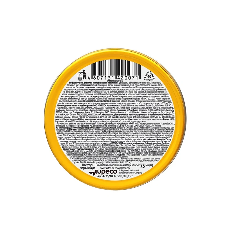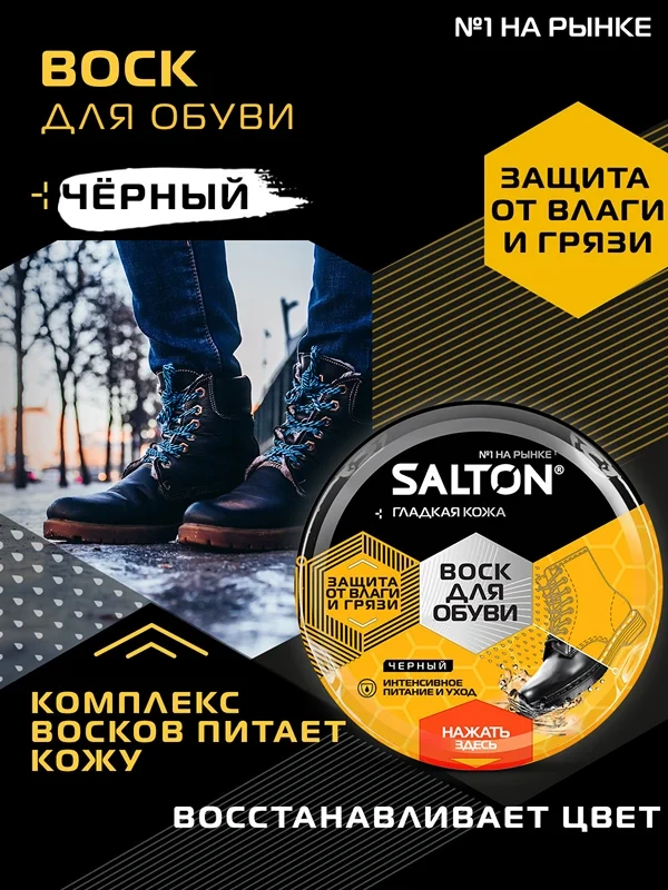 Воск для обуви Salton для гладкой кожи черный, 75мл - ухоженная обувь из натуральной кожи является непременным атрибутом успешного человека. Однако при переменчивой погоде с дождем, слякотью или снегом сложно сохранить первоначальный вид обуви. На помощь придет воск для обуви из гладкой кожи Salton. Воск Salton обладает двойным действием: он активно защищает кожаную обувь от негативного воздействия внешних факторов, а также обеспечивает коже глубокий уход. Благодаря содержанию норкового масла и целого комплекса восков, это средство для обуви интенсивно питает и увлажняет кожу, эффективно заполняет повреждения, выравнивая кожаную поверхность, и предотвращает появление трещин. Воск идеально подходит для обработки обуви перед хранением. Кроме этого воск для обуви Salton надежно защищает кожаную обувь от грязи, влаги и снега. Воск для обуви подходит для любой обуви из гладкой кожи, а благодаря крышке с щелчком, воск в банке легко и удобно открывается. Регулярное использование воска Salton продлит срок службы кожаной обуви.
