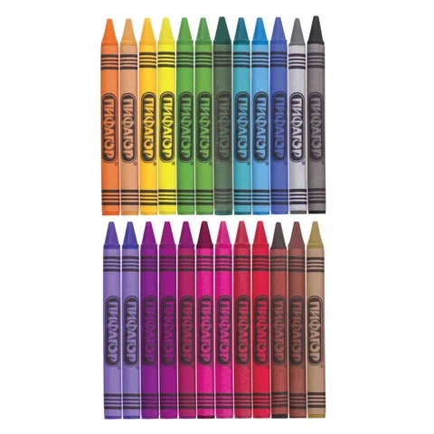 Палитра состоит из 24 ярких и насыщенных цветов. Полностью безопасны в использовании, не токсичны и не имеют резкого запаха. Благодаря своему составу карандаши пишут мягко, и ребенку не придется прикладывать усилия в процессе рисования. Круглая форма корпуса и диаметр 8 мм делают их удобными для тренировки руки к письму у дошкольников и детей младшего школьного возраста, формируют навык правильного захвата, снижают нагрузку на кисти рук. Каждый карандаш завернут в бумажную этикетку, что предохраняет от загрязнений, снижает скольжение, увеличивает прочность. Восковые карандаши упакованы в картонную коробку с европодвесом.