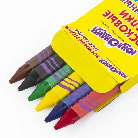 Палитра состоит из 6 ярких и насыщенных цветов. Полностью безопасны в использовании, не токсичны и не имеют резкого запаха. Благодаря своему составу карандаши пишут мягко, и ребенку не придется прикладывать усилия в процессе рисования. Трехгранная форма корпуса и диаметр 8 мм делают их удобными для тренировки руки к письму у дошкольников и детей младшего школьного возраста, формируют навык правильного захвата, снижают нагрузку на кисти рук. Каждый карандаш завернут в бумажную этикетку, что предохраняет от загрязнений, снижает скольжение, увеличивает прочность. Восковые карандаши упакованы в картонную коробку с европодвесом.