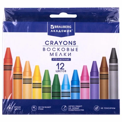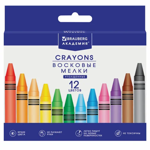 Восковые карандаши утолщенные BRAUBERG 'АКАДЕМИЯ', НАБОР 12 цветов, 227287