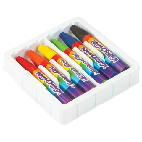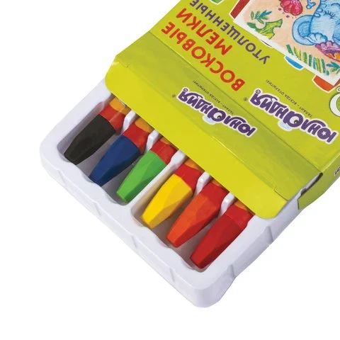 Палитра состоит из 6 ярких и насыщенных цветов. Полностью безопасны в использовании, не токсичны и не имеют резкого запаха. Благодаря своему составу карандаши пишут мягко, и ребенку не придется прикладывать усилия в процессе рисования. Утолщенная шестигранная форма корпуса и диаметр 11 мм делают их еще более удобными для тренировки руки к письму у делают их еще более удобными для тренировки руки к письму у детей, формируют навык правильного захвата, снижают нагрузку на кисти рук, отлично развивают мелкую моторику. Каждый карандаш завернут в бумажную этикетку, что предохраняет от загрязнений, снижает скольжение, увеличивает прочность. Восковые карандаши упакованы в картонную коробку с европодвесом.