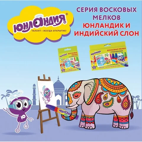 Восковые мелки утолщенные ЮНЛАНДИЯ 'ЮНЛАНДИК И ИНДИЙСКИЙ СЛОН', НАБОР 6 цветов, масляная основа, 227