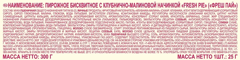 Пирожное Orion Fresh Pie Клубника-малина бисквитное (25г x 12шт), 300г