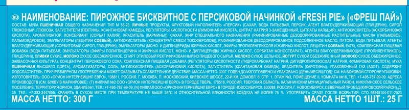 Пирожное Orion Fresh Pie Персик бисквитное (25г x 12шт), 300г