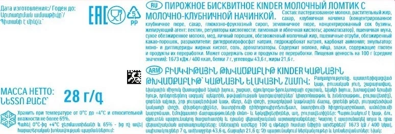 Пирожное Kinder Молочный ломтик бисквитное 27.9% 28г