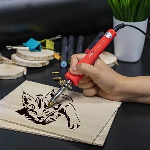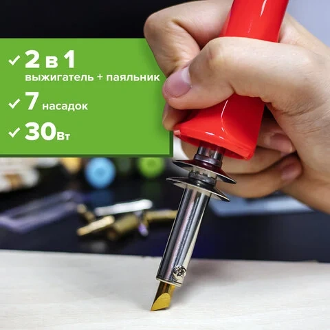 Прибор работает от сети с номинальным напряжением 220 В. Длина шнура - 1,2 м, мощность прибора - 30 Вт. Набор подходит для использования взрослыми и детьми старше 6 лет. В комплект входит выжигатель и специальная подставка для выжигания, благодаря которой достигается максимальное удобство использования. Помимо этого, набор включает 7 фигурных насадок, благодаря чему можно создавать различные узоры и рисунки. Материалы, из которых изготовлен прибор - металл и пластик.
