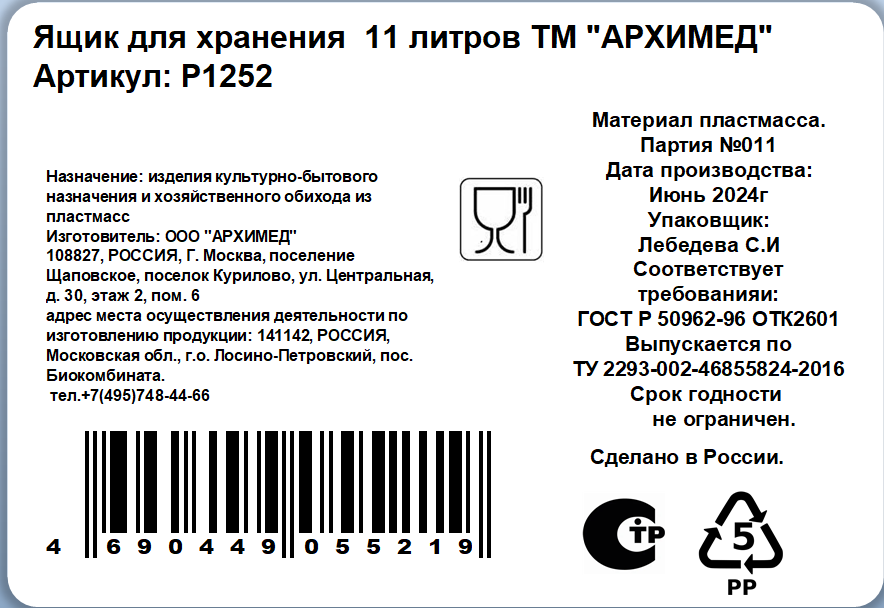 Ящик для хранения Архимед пластиковый 11л, 37 x 27 x 13.5см