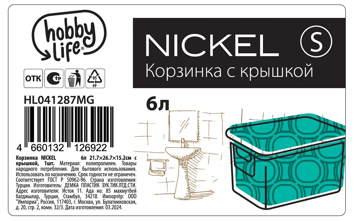 Корзина для хранения Hobby Life Nickel с крышкой белая 21.7 x 26.7 x 15.2см, 6л