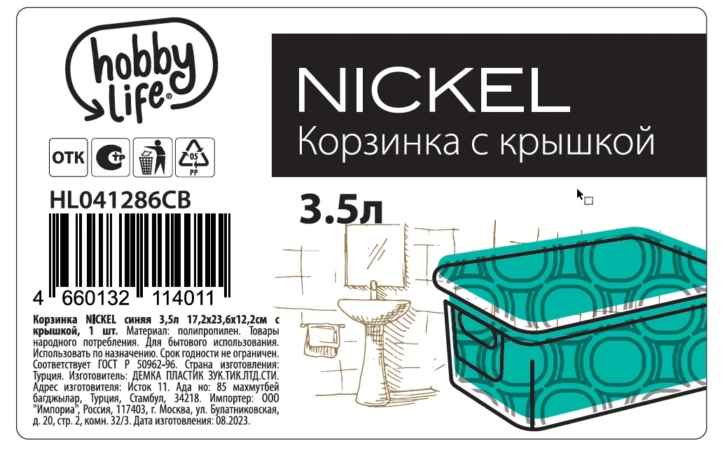 Корзина для хранения Hobby Life Nickel с крышкой синяя 17.2 x 23.6 x 12.2см, 3.5л
