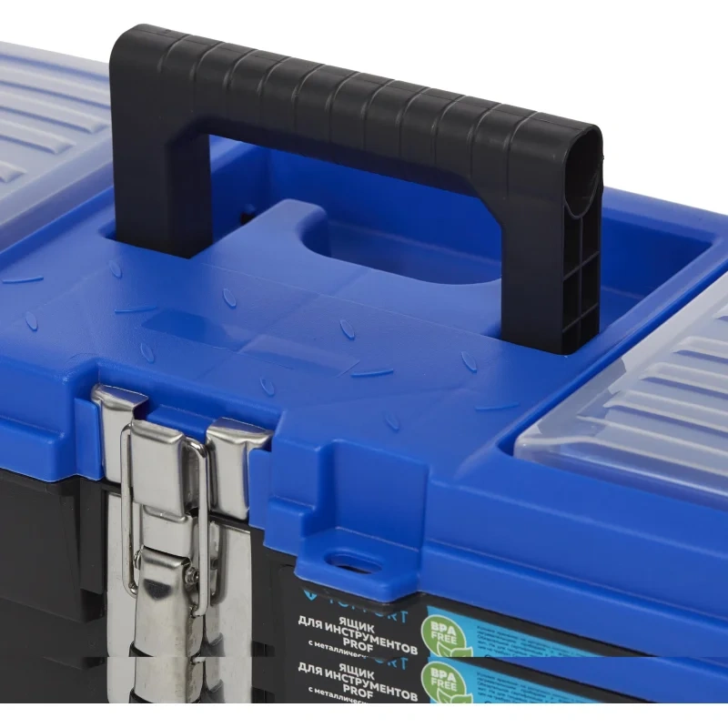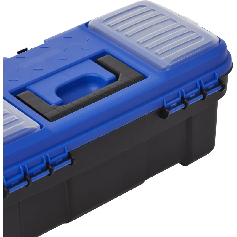 Крышка ящика оснащена органайзерами для хранения мелочей, а наличие ручки позволяет удобно переносить инструменты на место выполнения работ. Съемный внутренний лоток позволяет отделить инструменты и аксессуары первой необходимости от основного отсека. Ящик также оснащен петлей для навесного замка, что защитит содержимое от свободного доступа и обеспечит безопасность детей.