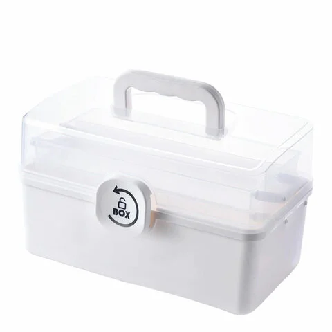 Трехуровневая универсальная аптечка-органайзер с раскладывающейся системой вместит в себя все необходимые медикаменты: сиропы, драже, градусники, бинты, вату, лейкопластыри — все, что рано или поздно может пригодиться в оказании помощи. Внизу размещайте все бутылочки, большие коробки и запасные лекарства, на втором уровне, в малых отсеках — то, чем пользуетесь обычно и регулярно, верхний уровень идеально подойдет для средств первой необходимости — пластырей, ваты, мазей от ожогов, обезболивающих и других медикаментов.