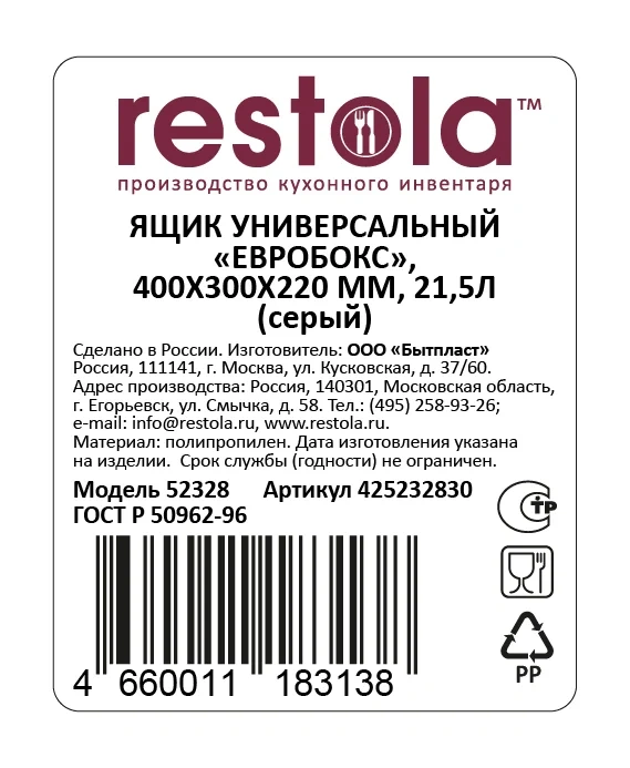 Ящик Restola Евробокс серый 21.5л, 40 x 30 x 22см