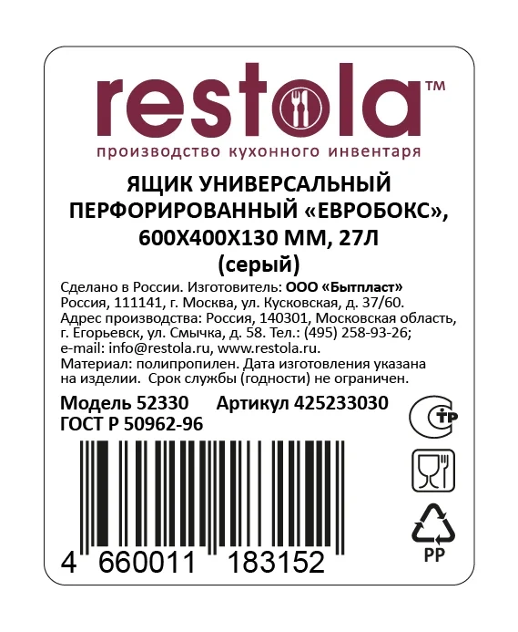 Ящик Restola Евробокс перфорированный серый 27л, 60 x 40 x 13см