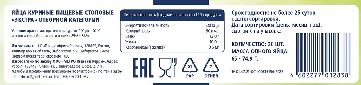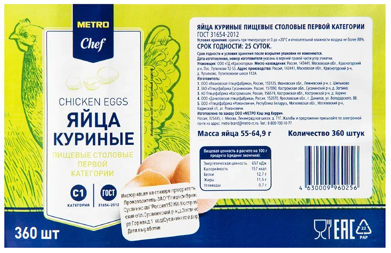 METRO Chef Яйцо куриное Экстра С1, 20шт