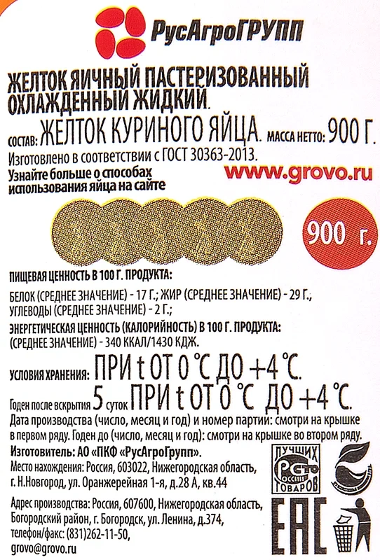 Желток яичный Grovo пастеризованный, 900мл